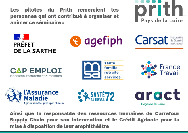 Dans le cadre du Plan Régional d’Insertion des Travailleurs Handicapés (PRITH) Pays-de-la-Loire, un séminaire maintien est organisé dans chaque département, tous les deux ans. Ces temps forts pour les professionnels du maintien sont co-construits et animés par les acteurs des territoires. Pilotées par les DDETS, l’Agefiph et la CARSAT, ces demi-journées ont deux objectifs :