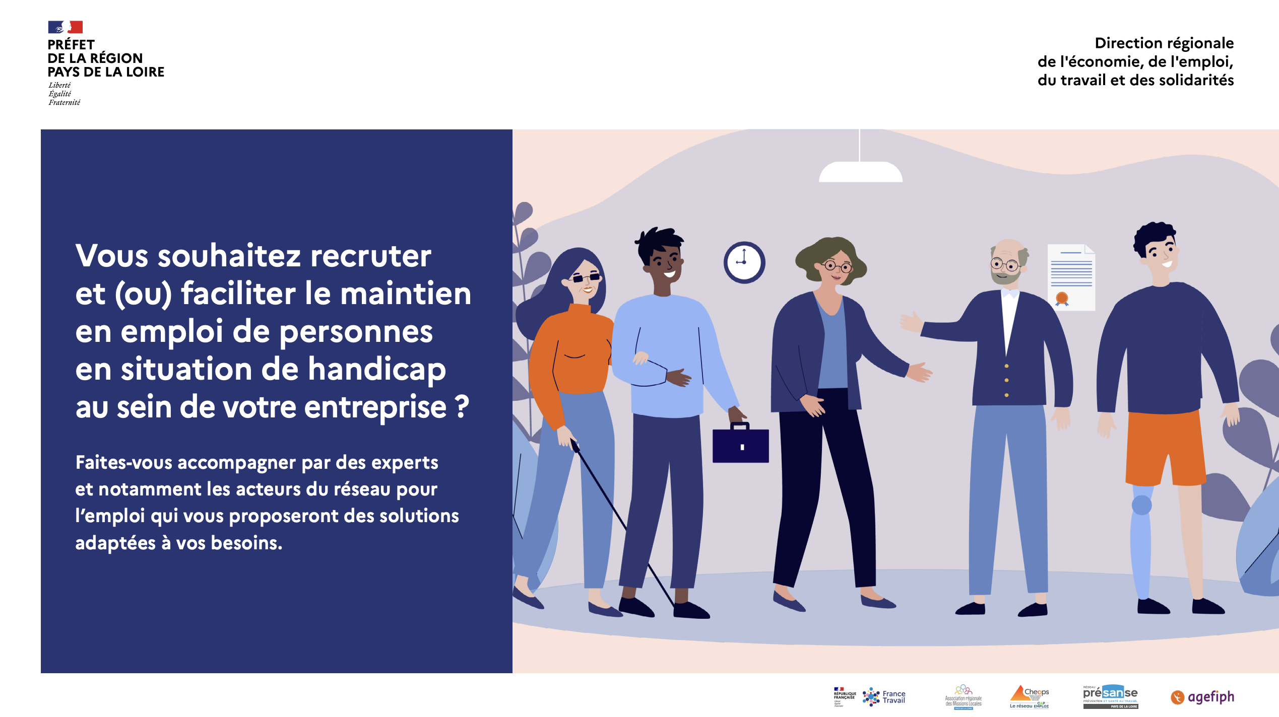 Un support ayant vocation à donner aux employeurs les premiers repères concernant le recrutement et le maintien des personnes en situation de handicap au sein des entreprises et à faciliter le repérage des acteurs ressources dans chaque département avec une cartographie de l’écosystème partenarial et des focus sur quelques aides de l’Agefiph.