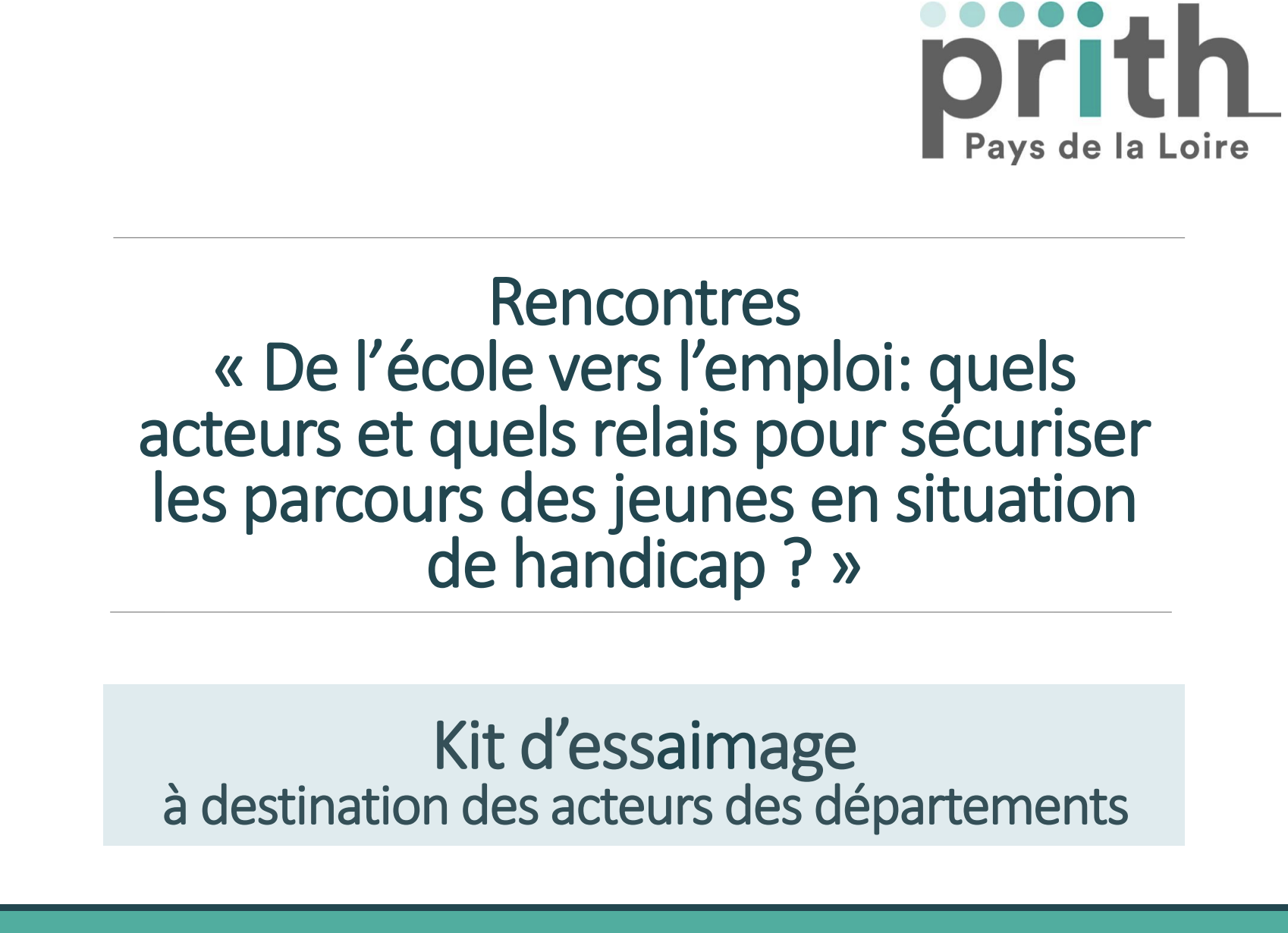 Tirant les enseignements de nombreuses éditions de rencontres territoriales d’interconnaissance des acteurs sur la thématique « De l’école à l’emploi » organisées en Vendée et en Loire-Atlantique, les partenaires du PRITH Pays-de-la-Loire ont élaboré un kit d’essaimage à destination des acteurs des territoires qui repèrent un besoin et souhaitent être moteurs dans l’organisation de tels évènements.